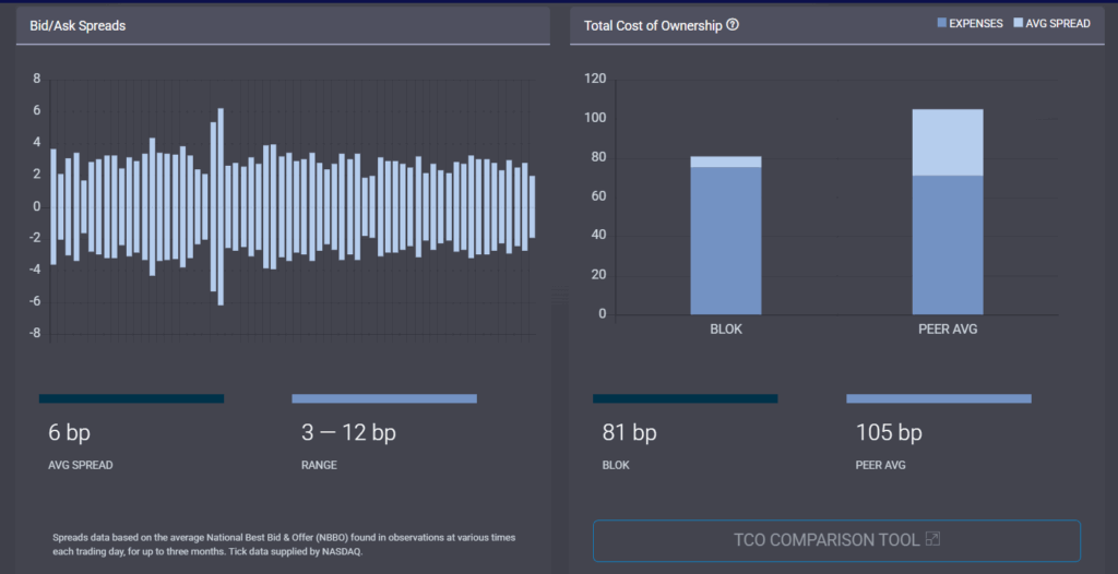 You can explore this data on any ETF’s focus page under the “Trading & Costs” tab, such as shown here: BLOK. The left-hand chart shows the historical bid/ask spreads, while the right-hand panel compares total cost of ownership for the fund’s peer group (in the case of BLOK, 130 actively managed Global Equity ETFs). For a direct, side-by-side comparison between any two ETFs, visit our TCO Comparison Tool.